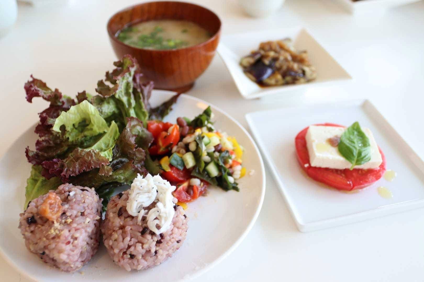 おにぎり、けの汁、白和えという
