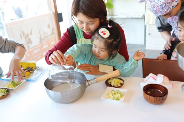 洗米や計量のチャレンジ、出汁の昆布や小豆の味見など、さまざまな体験をしながら、「おいしくなーれー♪」の声とともに、みんなで力を合わせて作ったさつまいもおこわ、季節野菜のみそ汁、白菜の即席漬けにデザートのくずもちは、おかわりが続出し、なんとすべて完食!!!