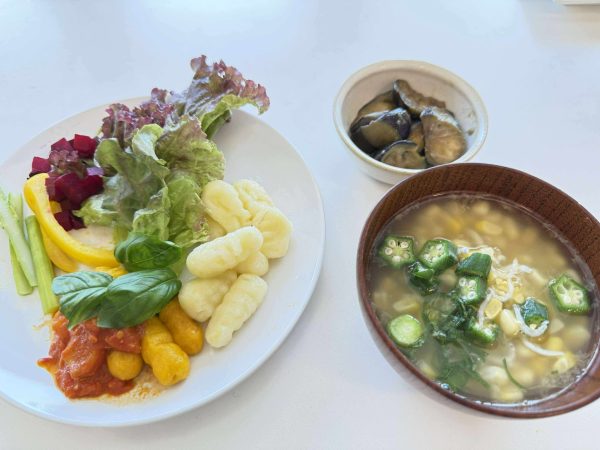 今月は、米粉を使ったじゃがいもとかぼちゃのニョッキ旬のとうもろこしのつぶつぶ感がたのしい和風コーンスープ。